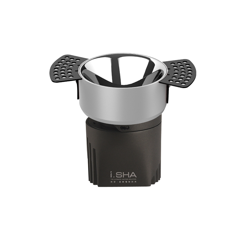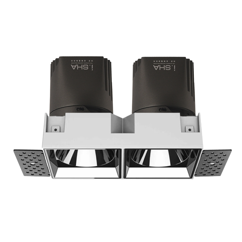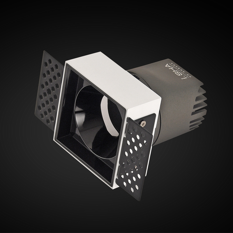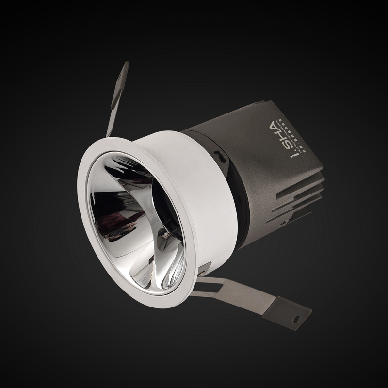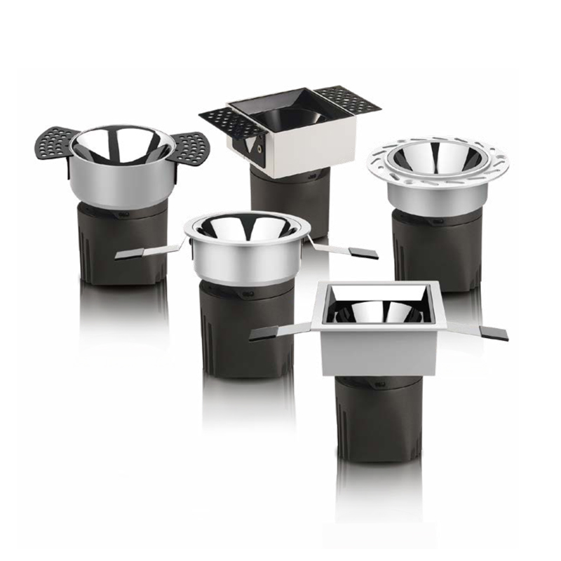 The construction includes a high-efficiency aluminum heat sink for effective thermal dissipation, a precisely shaped reflector and optical lens for controlled beam output, and a separated LED module that enhances long-term reliability. In addition, the trim and mounting system are designed for clean ceiling integration and easy installation in commercial projects.